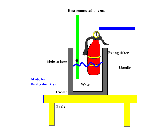 There is no chemical way to make oxygen. The fire extinguisher contains CO2. Not a very reactive gas. It doesn’t burn and the bond of oxygen to the carbon is strong. It would take a plant to make oxygen out of the carbon. Using the fire extinguisher would be lethal, but I might just have another use for it. As far as making oxygen from the water through electrolysis producing oxygen and hydrogen from a batteries current, it just isn’t possible due to the fact there is limited water and the process is slow and inefficient. There is no sense wasting air and effort trying to defeat the safe. There are no explosive materials and I am no safe cracker. My only hope is to find a way to get fresh air. And right now my best bet is in the top of the safe. A little 3/4 inch vent. Now I’m not sure of the exact mathematical formula. That is how much air entering the safe and how much CO2 I produce by breathing will give me what amount of breathable air. After all, gas is compressible. This is one of those mixture problems. You know the ones from calculus with salt entering and leaving the tank at a different rate. You remember those hard ones that take a differential equation. I’m not in the mood to do math right now, but I know that breathable air entering the vault is better than no air entering the vault. I begin to assess the room for my plan. I take the small table under the vent. I take the garden hose and place it into the vent cutting a slit if necessary. I then take a couple of rags wrap them around the hose and jam them into the vent to hold the hose in place being careful not to block the air flow. I do not have enough materials to explore the vent, but assume it is connected to a larger source of fresh, breathable air. Hopefully the water cooler is filled with water. That is what is going to bring the fresh air into the room. I continue working steadily and deliberately. I take the cooler and stick the hose in the water. I will fit the cooler to be open at the top. I want the water to fill at least a foot or more of the hose. I can stick objects into the water to get the desired volume shape of the water. Now for the other part of the simple devise the fire extinguisher. It isn’t going to be activated. That would prove to be deadly. It is simply going to raise the level of the water up and down. This will create a makeshift pump. It has to be man powered, but more importantly it will keep me alive until the vault’s timer unlocks. I place the extinguisher vertically holding it to the side of the cooler with pieces of the steel cable. I tape the pin of the extinguisher so it doesn’t accidently spray. Then a make a lever out of the yard stick and use the chalk line reel as a fulcrum. This will serve to push the extinguisher up and down rasing and lowering the water level. I then put a hole in the hose slightly above its highest level when the extinguisher is not in the water. So as the extinguisher goes into the water adding volume to increase the height of the water in the hose a pump is formed as the extinguisher goes out of the water (it has the tendency to float, hence the wire to make it easy to control) the water level will decrease pulling air from the small vent into the room. This air will exit the hose from the hole made slightly above the peak of the water line before the fire extinguisher is pressed into the water. This will create a sucking action much like plunging a drain. The water shape and height and volume of the water cooler can be adjusted by estimation. I see no easy solution. This one requires me to perform work and use slightly more oxygen. To figure out the amount of time vs oxygen is too complex of a math problem. The amount of oxygen consumed would have to be estimated. There is no time for math problems. The more time wasted on calculations and thinking of a plan is air lost. This plan must work! |