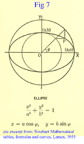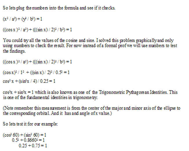 So now we have an ellipse that has similiar properties to that of a unit circle. (In having a way of describing the sine, cosine, and tangen.) But as we have seen this is an extremely extraordinary ellipse. It explains the sine, cosine, and tangent. But the wonder is in where the equation and shape fit the requirements to form an ellipse. It is important to note that this equation and shape does not explain every single ellipse in the way that the unit circle explains all circles. This is a special ellipse and it might hold many uses to explain things the way the sine and cosine do, but ellipses consist of many different shapes and sizes unlike circles. But the ellipse does have possible other applications and is unique enough to be worth studying. |