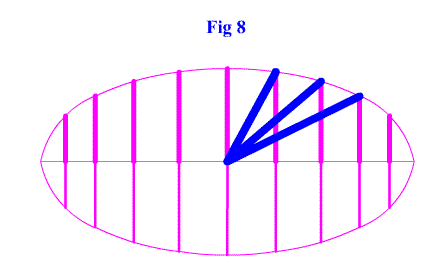 Figure 8 explains the length that was solved for in the previous equations. The length is in blue and 1/2 sin is in the bold magenta. This equation is similar if the sine is graphed in the x axis and the cosine is the y axis. Everything is done in almost the same way, but instead of the slope of the trianges formed being the tangent, it is the cotangent. |